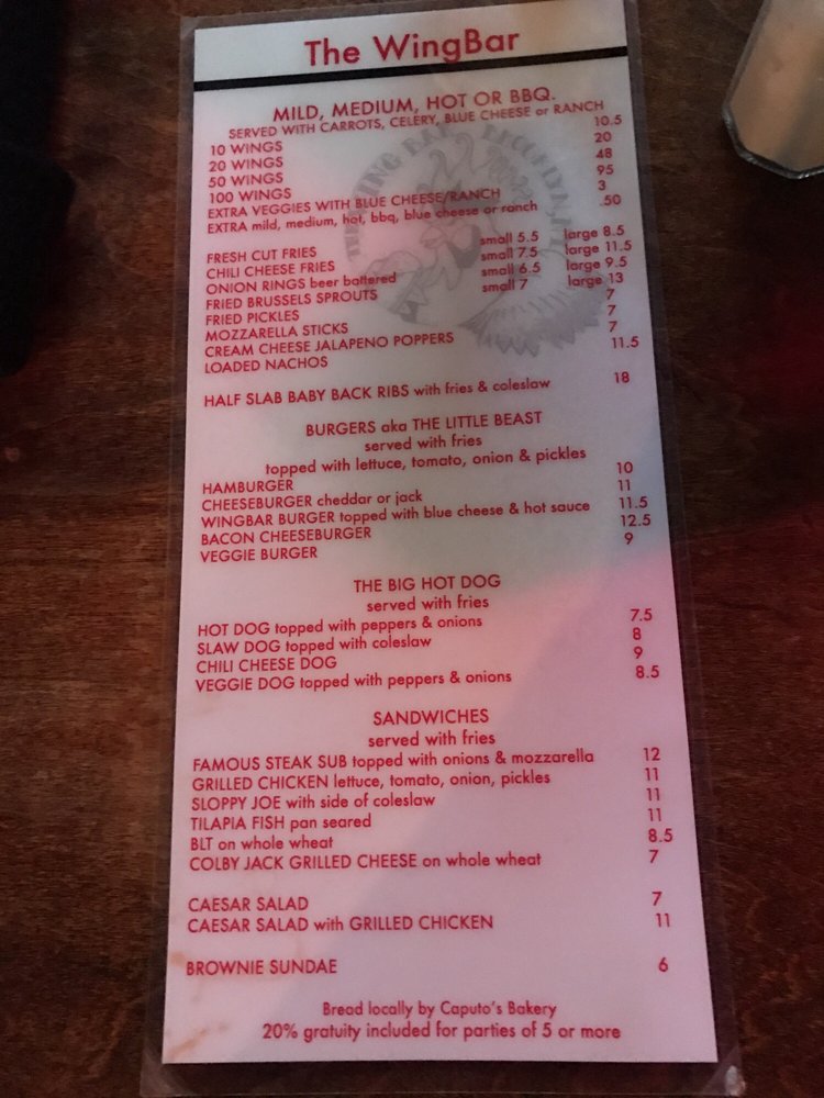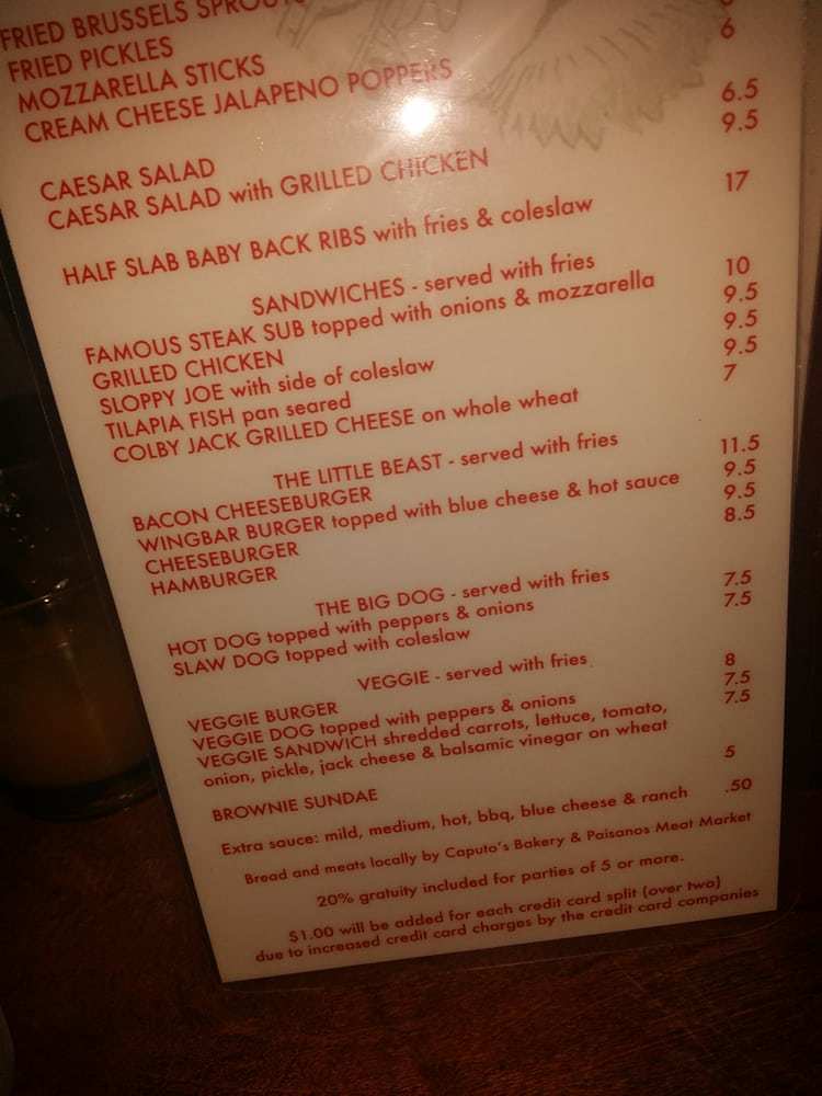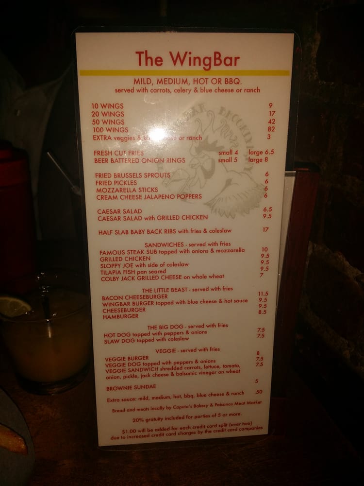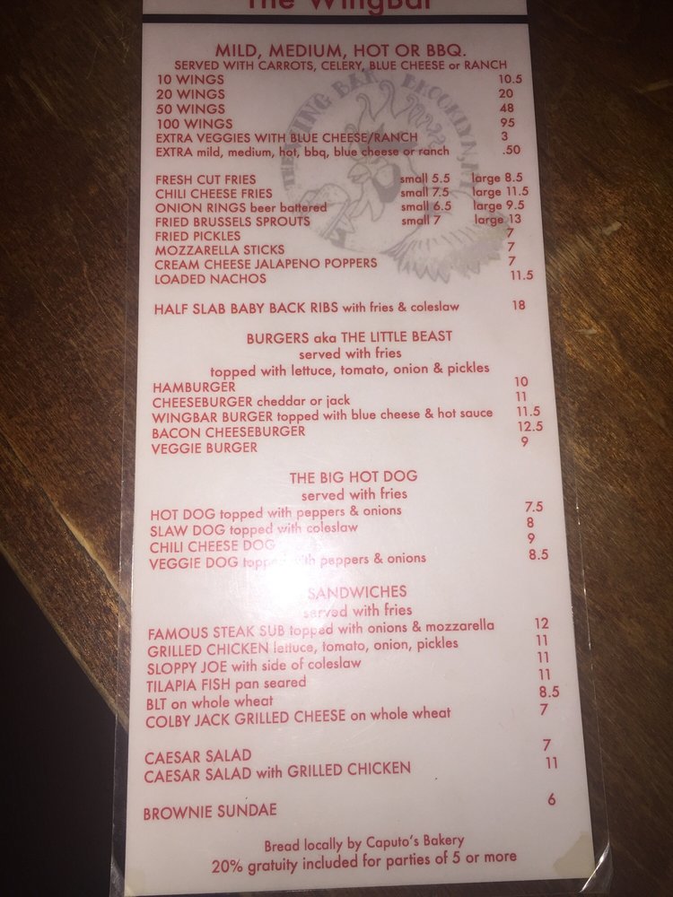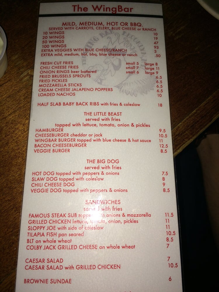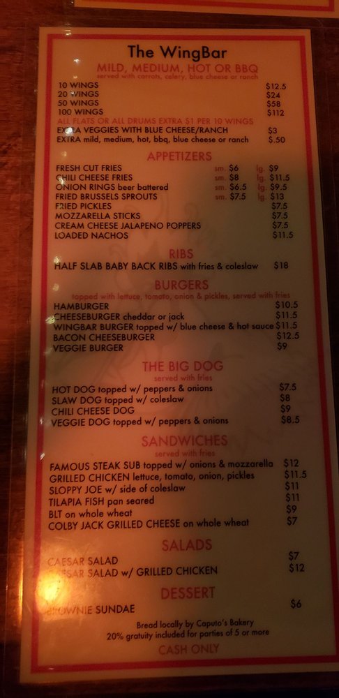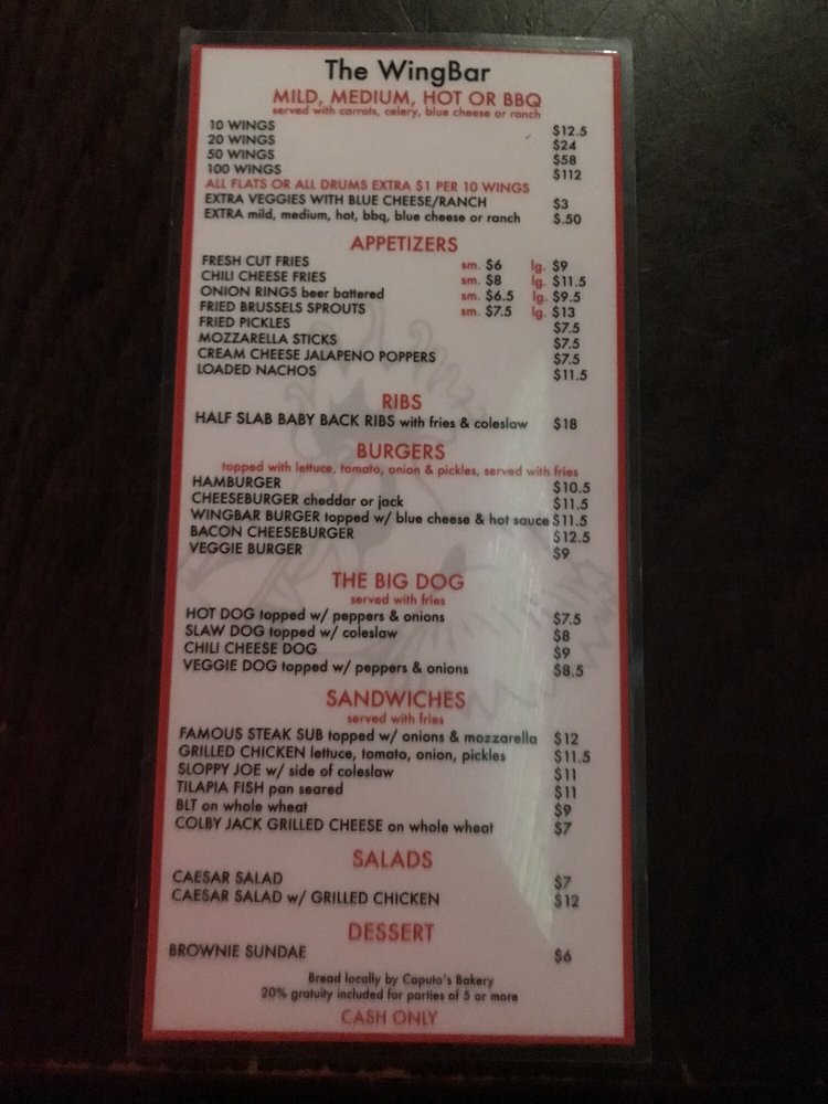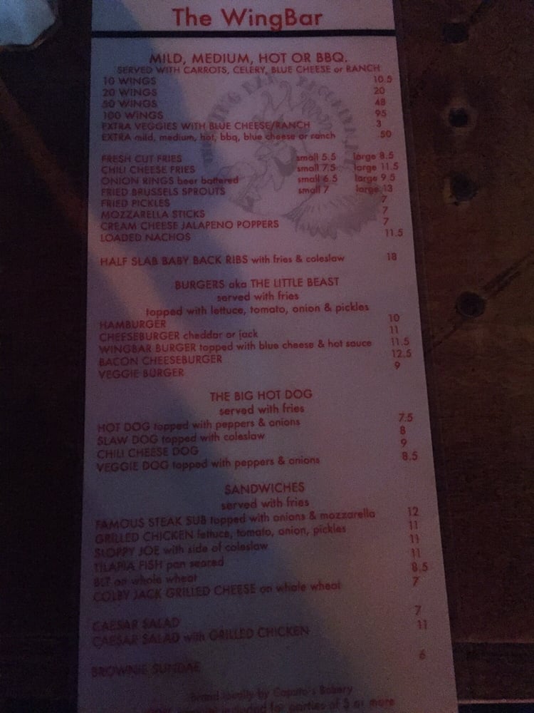Introducing the menu at The Wing Bar, located in Brooklyn, NY, where the main attractions are burgers, chicken wings, and a sports bar atmosphere. This casual dive bar offers a range of utilities like delivery, takeout, reservations, and outdoor seating. Catering to various dietary preferences, they have many vegetarian options available. The bar accepts credit cards, Android Pay, Apple Pay, and even cryptocurrency. With a full bar, TV, pool table, and free Wi-Fi, it's a great spot for groups, kids, and late-night dining. Customers rave about the wings, burgers, sloppy joes, and friendly staff. From the quiet outdoor patio to the busy inside seating, The Wing Bar is a go-to for delicious wings and a laid-back atmosphere. The best nights to visit are Thursday, Friday, and Saturday.